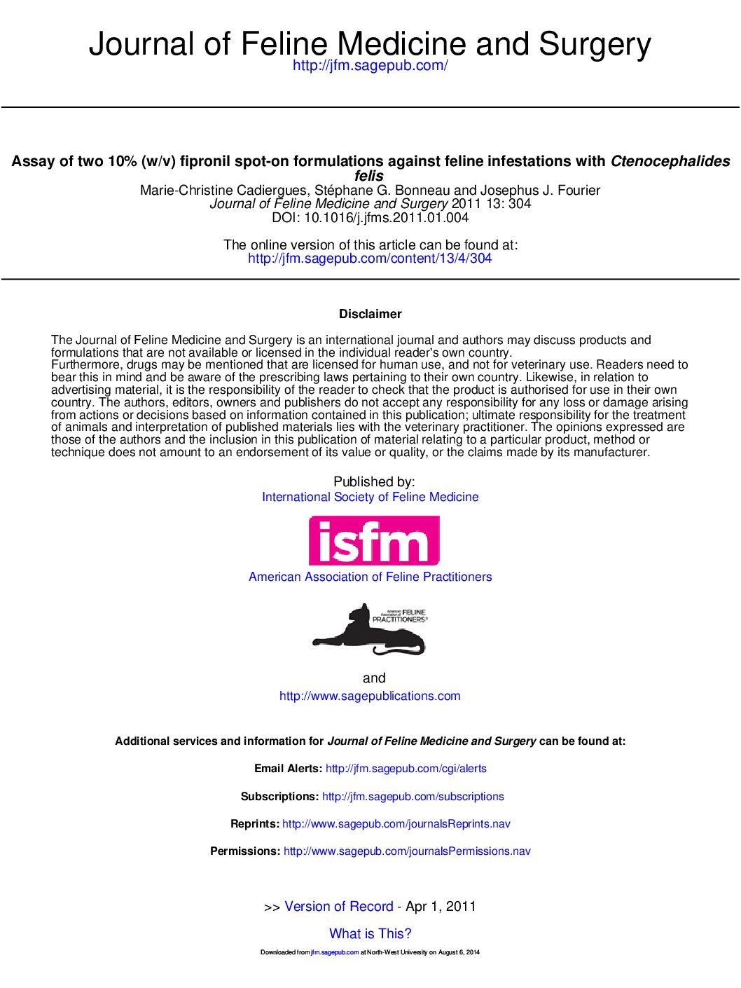 Assay of two 10% (wv) fipronil spot-on formulations against feline infestations with Ctenocephalides felis