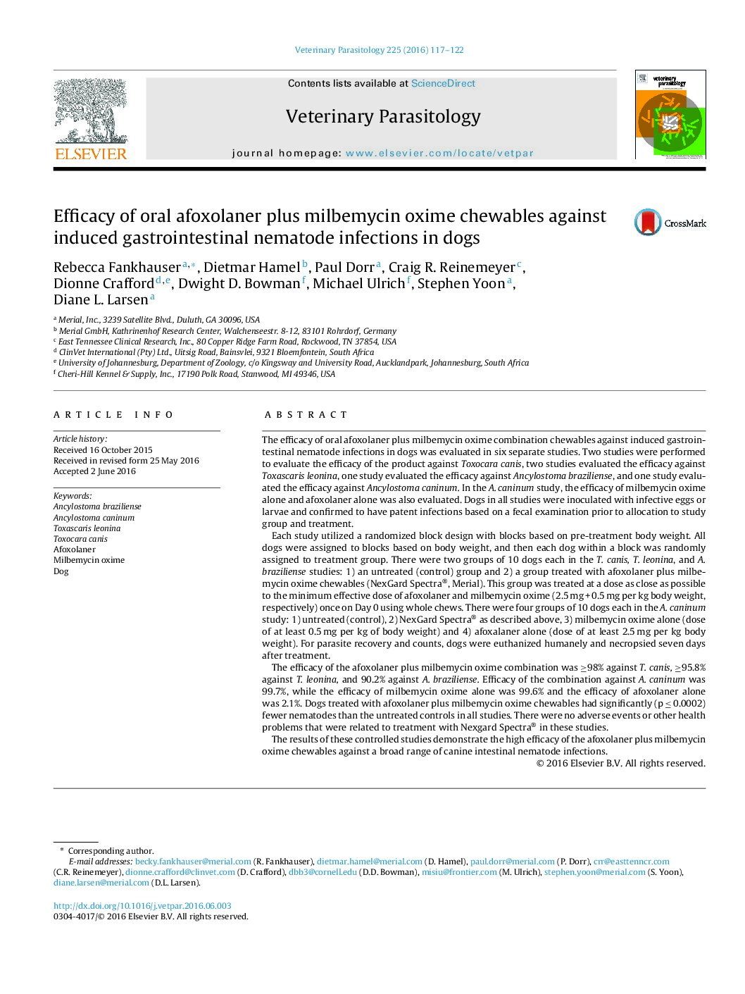 Efficacy of oral afoxolaner plus milbemycin oxime chewables against induced gastrointestinal nematode infections in dogs