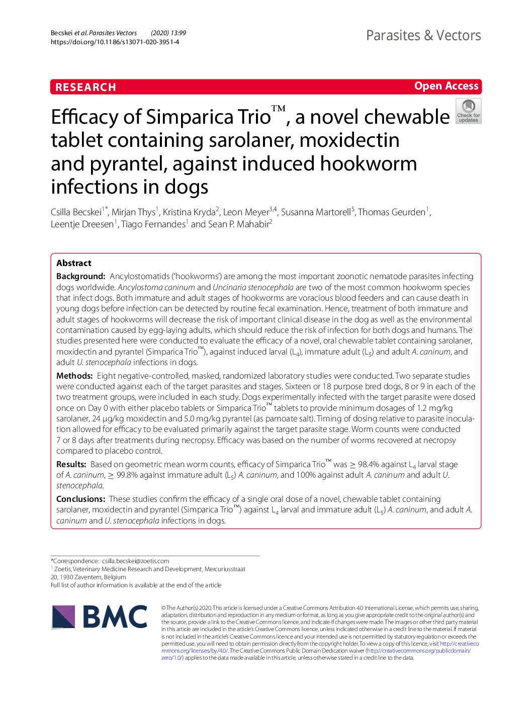 Efficacy of Simparica Trio™, a novel chewable tablet containing sarolaner, moxidectin and pyrantel, against induced hookworm infections in dogs